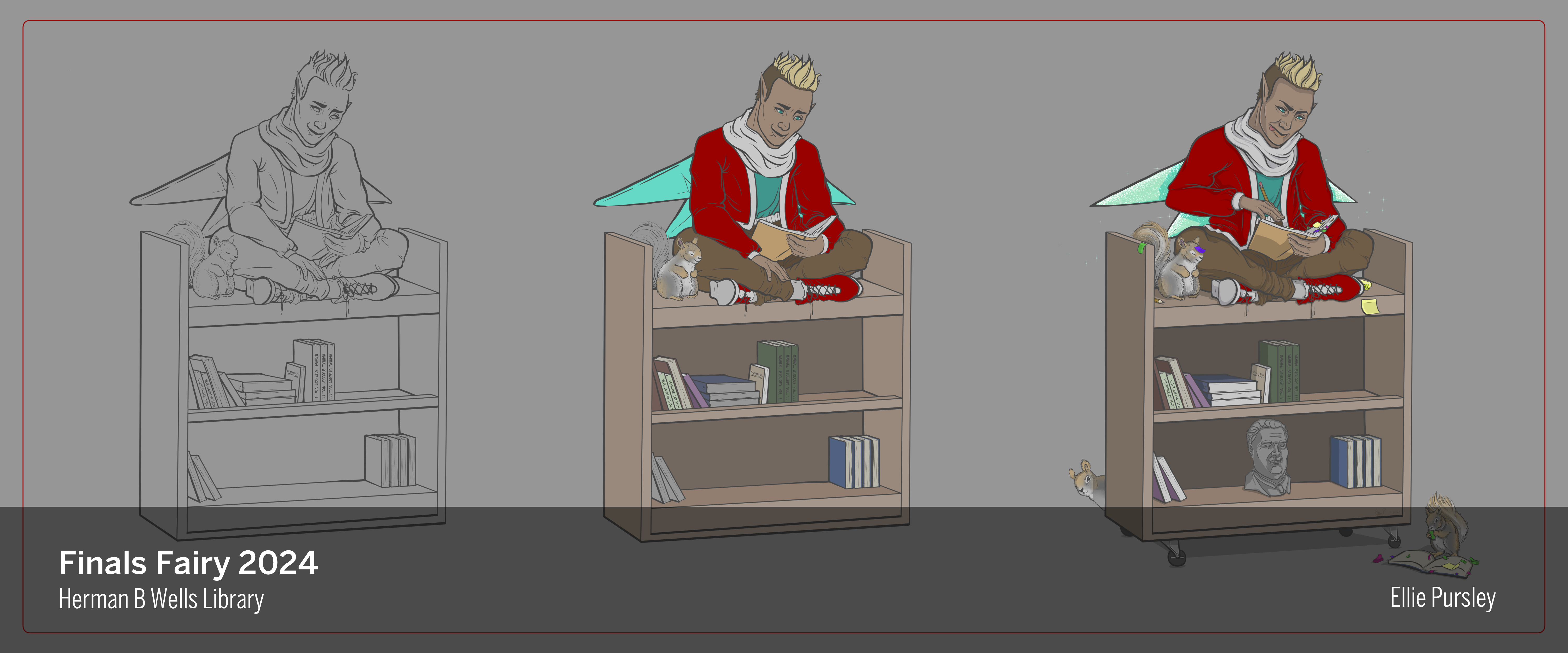 An identifying character to market the Herman B Wells Library Final’s week. The Finals Fairy is supposed to capture a student’s eagerness to end the semester while embodying the ideology of a fairy. He is playful and intelligent, encouraging students to do their best while also finding time to take care of themselves.
